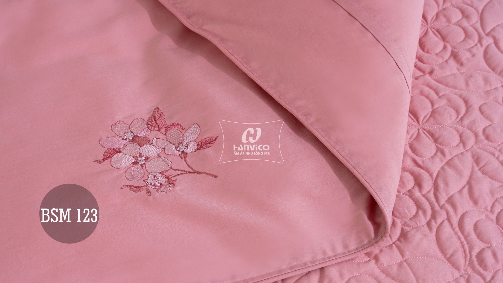 Bộ ga Hanvico phủ thêu Blue Sky – BSM123 với những bông hoa xinh đẹp đang khoe sắc nở rộ trải trên nền cam đào, nhẹ nhàng, thuần khiết, e ấp như tình cảm tuổi thanh xuân. Với các gam màu động, sự luân chuyển màu sắc mang đến 1 cảm giác trong trẻo, nhẹ nhàng. Bên cạnh đó, BSM 123 còn hướng đến niềm tin yêu cuộc sống vẫn luôn hiện hữu , như cây táo vẫn luôn nở hoa…