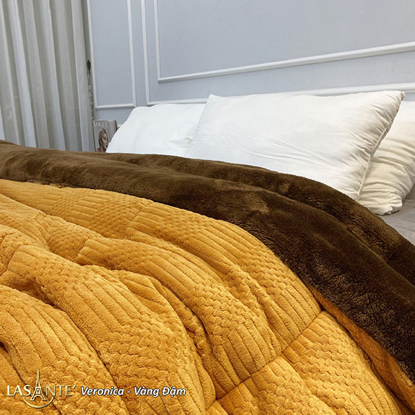 Chăn lông cừu Lasante Veronica màu vàng được đắp 2 mặt với thời tiết từ âm độ đến 25 độ, khi thời tiết lạnh đắp mặt lông cừu, khi thời tiết nóng hơn 1 chút đắp mặt cừu nhung phía trên làm cảm giác mềm và vẫn nhẹ nhàng không nóng bí.